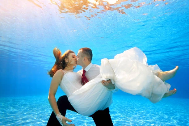 Um evento matrimonial realizado no fundo do oceano, combinando a beleza natural do ambiente marinho com a singularidade de um enlace inusitado, destacando-se pela atmosfera exclusiva e pelas possibilidades fotográficas únicas.