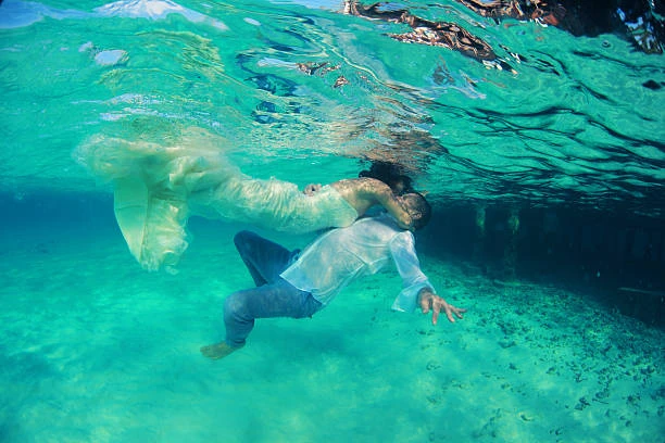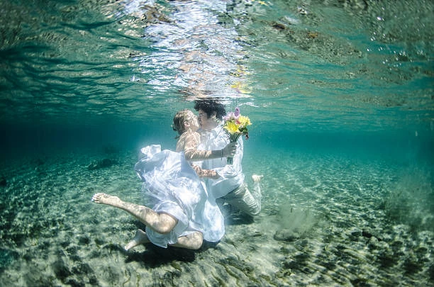 Um casamento subaquático é uma cerimônia realizada debaixo d'água, onde os noivos trocam votos e alianças em um ambiente subaquático.